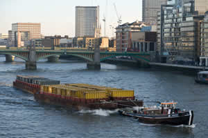 自走できないはしけが、船に引かれてバ~ッと運河に押し入るイメージ。