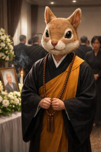 フェイスにリスのお面を着けて葬式に来た不誠実な坊さんをイメージ。