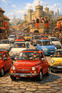 王様の決定で、国民はフィアットに乗らなければならないイメージ。